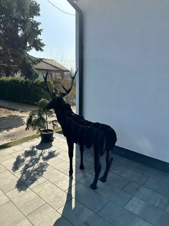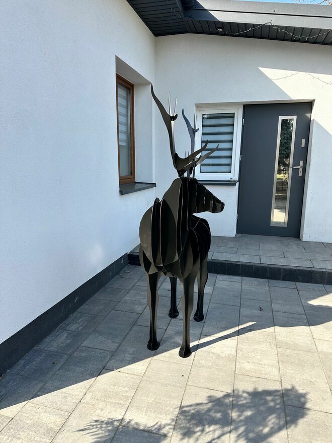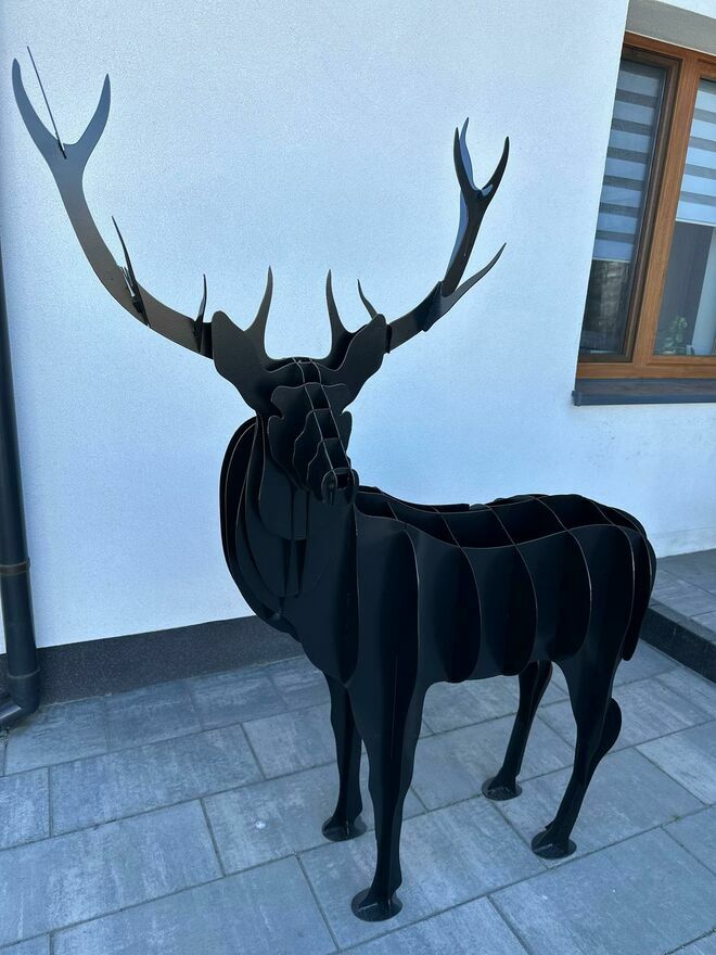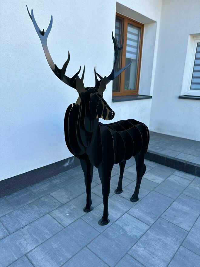 Wyjątkowa dekoracja – przestrzenna figura łosia 3D. Solidna konstrukcja z metalowych elementów, pomalowana na elegancki czarny kolor. Idealna jako ozdoba ogrodu, posesji, restauracji, hotelu lub przestrzeni biurowej.Wymiary: wysokość 1800 mm, długość 500 mm, szerokość 1600 mm.